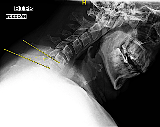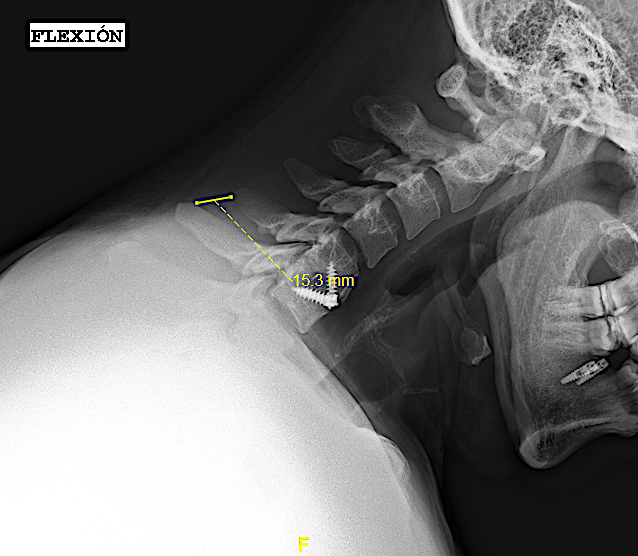Mismo paciente de la imagen anterior; ahora en flexión. Obsérvese que, pese a estar fusionado es difícil obtener la misma medida al medir la distancia interespinosa
