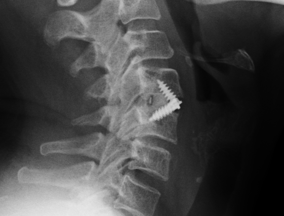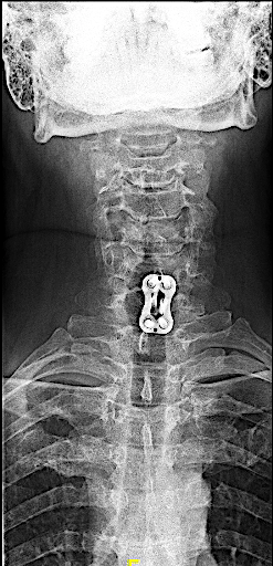 Obsérvese en la RX AP cervical que, tanto la caja intersomática como la placa, tuvieron que desplazarse ligeramente a la izquierda, donde había integridad de platillos. Dada la existencia de pseudoartrosis y destrucción de platillos, consideré oportuno reforzar la caja atornillada con una placa cervical.