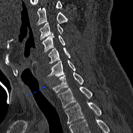 A continuación, presento imágenes de un caso con pseudoartrosis C6-C7 intervenido en otro centro en 1995, sin informes quirúrgicos del material de implantación. La flecha azul señala la ubicación lateral derecha de la(s) caja(s) con extrusión anterior parcial del material. La flecha roja delimita la altura preoperatoria del disco; parece que existe cierta integridad de platillos en la hemivértebra izquierda.