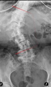 La escoliosis define la existencia de una desviación del eje de la columna en su plano coronal (una curvatura anómala de la columna vista de frente). Como las vértebras están articuladas, la rotación de las mismas también afecta el perfil (balance sagital) provocando a menudo una espalda plana.