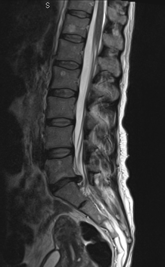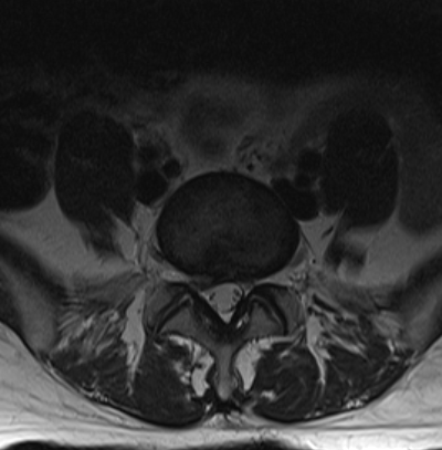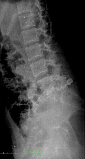 La paciente fue intervenida con un abordaje posterior medial (incisión de 3-4 cm) y con técnica microquirúrgica se realizó una discectomía L5-S1 derecha, preparación de disco y colocación de prótesis intersomática de titanio asociada a fijación transfacetaria. Obsérvese en la imagen anterior la adecuada alineación de facetas así como una adecuada amplitud de las mismas para realizar una fijación transfacetaria bilateral. En el caso que hubiésemos tenido que quitar mucha faceta ipsilateral o esta se hubiese fracturado, habríamos completado la fusión con dos tornillos transpediculares.