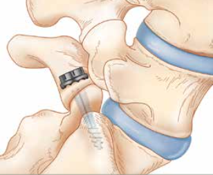 La fijación transfacetaria lumbar consiste en fijar dos vértebras mediante un tornillo que atraviesa la faceta superior y la inferior tras preparar la superficie articular. Los tornillos suelen emplearse bilateralmente y, aunque presentan buen aval biomecánico respecto a otros sistemas de instrumentación clásicos, se pueden asociar a una fusión anterior si se combinan con un injerto intersomático.