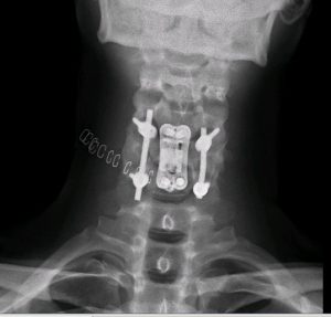 Se realizó corpectomía C5 con reconstrucción anterior en un primer tiempo (prótesis expansible + placa cervical). En el mismo acto, se dio la vuelta al paciente y se realizó una fijación posterior para asegurar el montaje (dadas las lesiones ligamentosas asociadas).