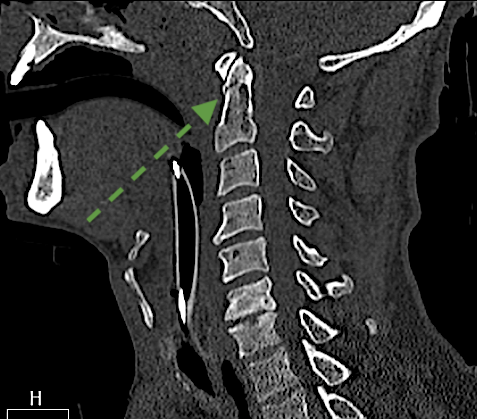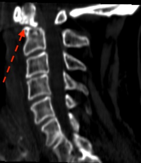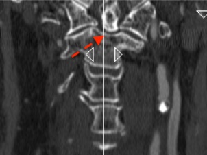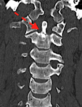 Sin embargo, la reconstrucción coronal del mismo paciente nos indica claramente que la fractura (flecha roja) se ubica en la base de la odontoides