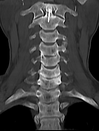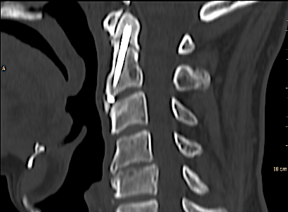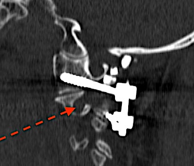 En este caso se decidió atornillado anterior (técnica de Apfelbaum) con un solo tornillo (el cuello estrecho de la odontoides nos planteó dudas para ubicar dos). El paciente mejoró en el postoperatorio inmediato, sin presentar complicaciones ni secuelas.
