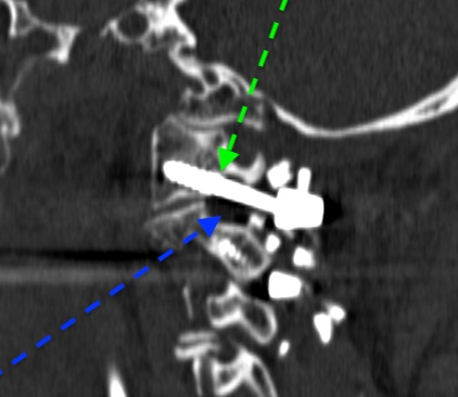 El tornillo que se fija en masa de C1 posee un segmento roscado y otro liso (flecha verde). En el foramen C1-C2 se encuentra la raíz C2 (flecha azul).