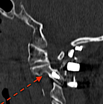 La artrodesis occipito-cervical se indica en casos con configuración anatómica vascular no favorable en C2 para fijación posterior, lesiones extensas en segmentos O-C1-C2 o fracturas conminutas. Produce como secuela previsible la inmovilización cervical prácticamente completa en rotación y fleco/extensión, por lo que el paciente requiere de un entrenamiento postoperatorio para subir/bajar escaleras. Es importante fijar la mirada al frente para no alterar el balance sagital (si mira hacia arriba flexionará la cintura pélvica para compensar y si se fija hacia abajo, provocará un sobreesfuerzo de la musculatura pelviana en la extensión).