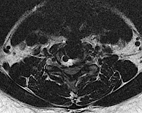 Sección axial C6-C7. Obsérvese el área hiperintensa en T2 que se corresponde con la resección de platillo posterior C7. La caja se lateralizó ligeramente a la izquierda.