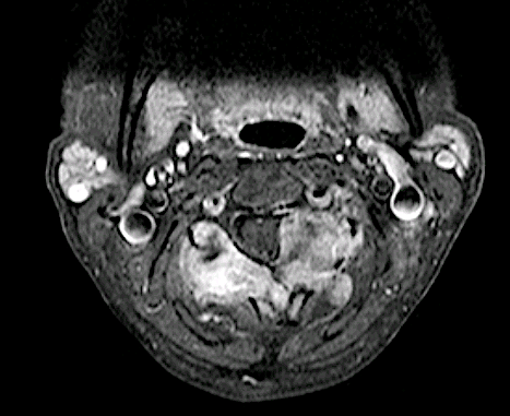 El caso presentaba interés quirúrgico porque el tumor presentaba límites imprecisos (extracompartimental), parecía estar en relación con arteria vertebral dominante y comprimía el saco dural. Se realizó un abordaje posterior para exéresis macroscópica completa. La arteria vertebral se disecó perfectamente al no estar englobada en la masa.