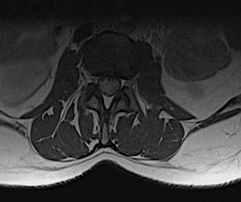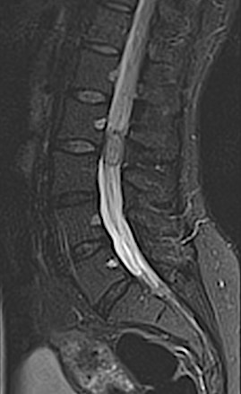 En informe de RM fue diagnosticado como lesión sugestiva de schwannoma, ependimoma o (menos probable) meningioma. La paciente fue intervenida con monitorización neurofisiológica intraoperatoria y la lesión carecía de cápsula e «infiltraba» las raíces, por lo que se realizó una exéresis incompleta con caída parcial de potenciales que recuperó en pocas semanas. La AP demostró la malignidad del cuadro.