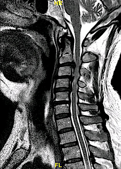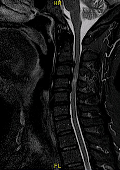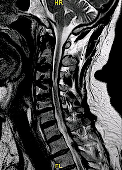 Paciente con clínica de mielopatía que presenta esta RM cervical con una estenosis de canal en segmentos tan inusuales.