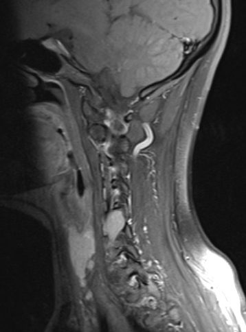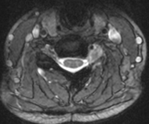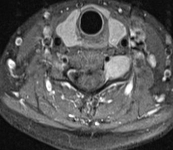 Tumoración en espacio extracanal y extraforaminal, que capta gadolinio de manera homogénea y que se encuentra adherida a arteria vertebral izquierda.