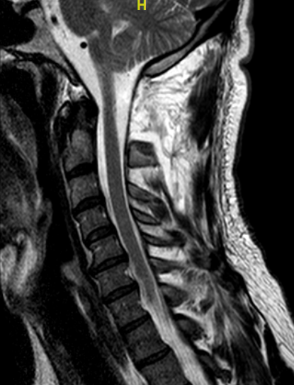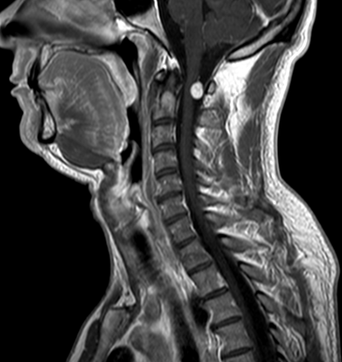 Paciente 34 años que presenta cervicalgia con irradiación a hombro derecho de meses de evolución. En RM cervical se aprecia lesión intradural extramedular informada como schwannoma (menos probable meningioma) a la altura del arco de C1.