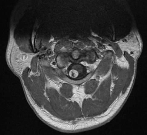 Se realizó un abordaje posterior, con hemilaminectomía derecha de atlas y exéresis de la lesión que parecía adherida al cordón medular a simple vista pero que, tras disección microscópica, pudo identificarse su origen en el segmento más proximal de una radicela del espinal derecho. Tras la exéresis completa, no se constató ningún déficit motor significativo durante la monitorización neurofisiológica intraoperatoria (MNIO) ni en postoperatorio inmediato.