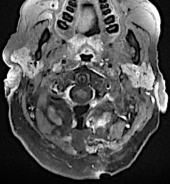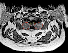 Imagen especular: en la derecha se ha marcado en rojo los schwannomas y en amarillo la médula. Se aprecian las raíces C2 engrosadas.