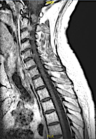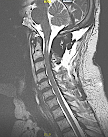 Paciente con clínica de mielopatía cervical de años de evolución, enmascarada por una PNP severa que era tratada con inmunoterapia (cuando ésta no fue efectiva, se realizó RM).
