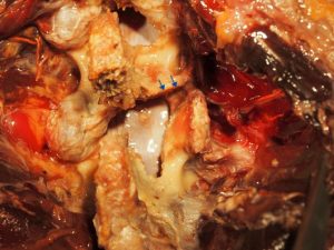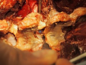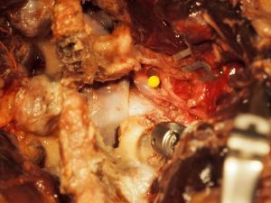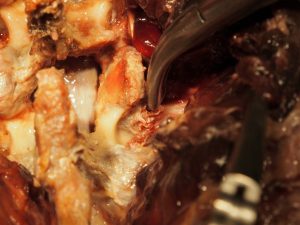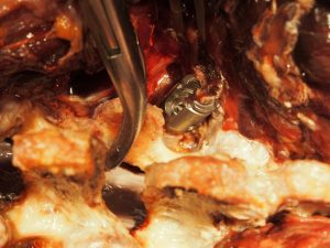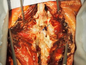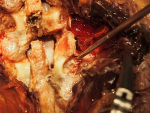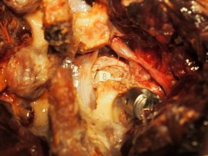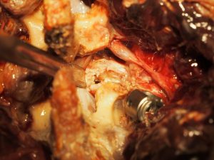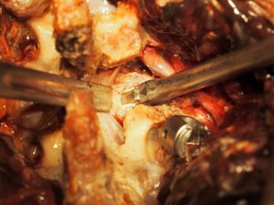 Discectomía en margen lateral (en esta foto, se ha apartado el saco dural para visualizar mejor el disco, pero en los TLIF’s puros apenas se vislumbra el saco).