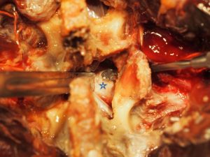 El separador ( a la izq de la imagen) aparta el saco dural para mostrar el disco (estrella). El disector entra en el canal a través del foramen (transforaminal).