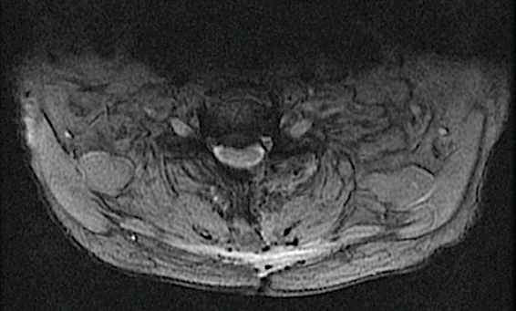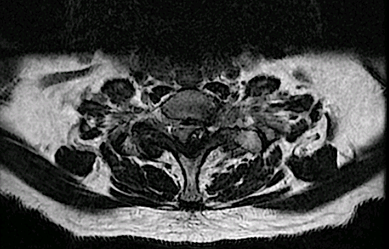 Se decidió abordaje posterior, para descompresión y biopsia. El resultado de la AP fue compatible con material degenerativo. La visión quirúrgica confirmó las sospechas de quiste sinovial.
