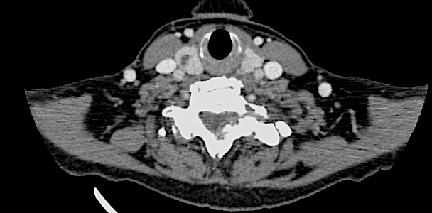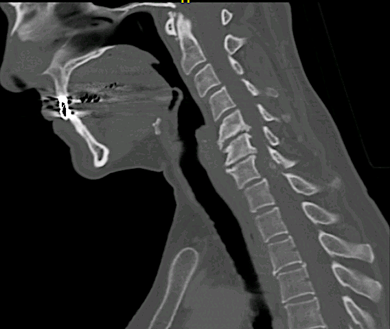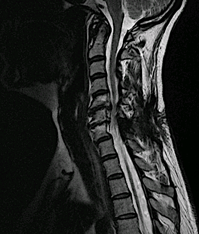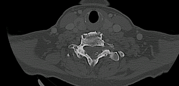 Se solicitó un TC observando signos de espondilosis avanzada C5-C6-C7 y ausencia de infiltración ósea.